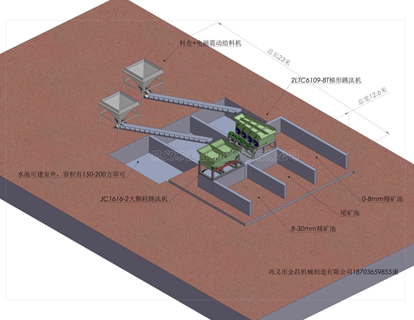鞏義市金昌機(jī)械專業(yè)生產(chǎn)跳汰機(jī)設(shè)備,今天為大家介紹兩種常用的跳汰機(jī)設(shè)備。一種是2LTC6109-8T梯形跳汰機(jī),一種是JC1616-2大顆粒跳汰機(jī)。前者是分選0-8毫米之間的螢石礦,后者是分選8-30毫米之間的螢石礦,單臺每個(gè)小時(shí)處理量都在20-30噸之間,如果是選其它的礦物,處理量會更大一些。前者是下排料跳汰機(jī),也就是精礦從跳汰機(jī)肚子下邊出,后者是篩上排礦的跳汰機(jī),精礦和尾礦都從跳汰機(jī)上邊出。兩種跳汰機(jī)是黃金搭檔,使用的朋友也比較大,大體怎樣布局您可以參考一下下圖,希望對您有幫助。