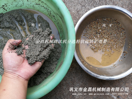 近段時間,安徽銅陵的客戶到我單位做小型跳汰機選礦實驗,客戶帶的是粉狀硫鐵礦,里邊含泥量是很大的,但是泥土沒有任何的粘性,這也是客戶篩分好的顆粒,我們可以用跳汰機直接進行分選,起初客戶對跳汰機是比較懷疑的態度,認為跳汰機分選這種硫鐵礦效果達不到搖床的質量,但是經過我們對跳汰機的調節,最終選出了合格的精礦和尾礦,客戶對此也是非常滿意的。