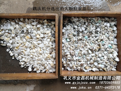 重晶石的比重較大,而脈石的比重較小,兩者有明顯的比重差,跳汰機正是根據(jù)物體比重差進行分選的設(shè)備,大小不同顆粒可能分別跳汰,效果非常明顯,可能您還是很擔(dān)心跳汰機分選是否穩(wěn)定,別一會跳的好,一會跳的差,這是不會的,只要將跳汰機調(diào)節(jié)好,跳汰機可連續(xù)不斷的分選出合格的精礦和尾礦,您也可以帶礦樣到我單位進行小型跳汰機分選實驗,實驗滿意后在購買設(shè)備,詳詢18703659855康,網(wǎng)址:www.jcks.cn www.hzxhl.com.