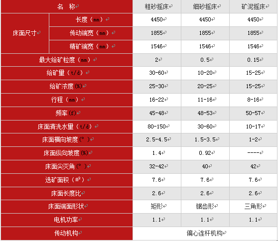 搖床選礦是一個(gè)傾斜的床面上借助機(jī)械石板對稱往復(fù)運(yùn)動(dòng)和薄層斜面水流等聯(lián)合作用,使礦粒在床面上松散分層,分帶,從而使礦物按密度不同來進(jìn)行分選的過程。