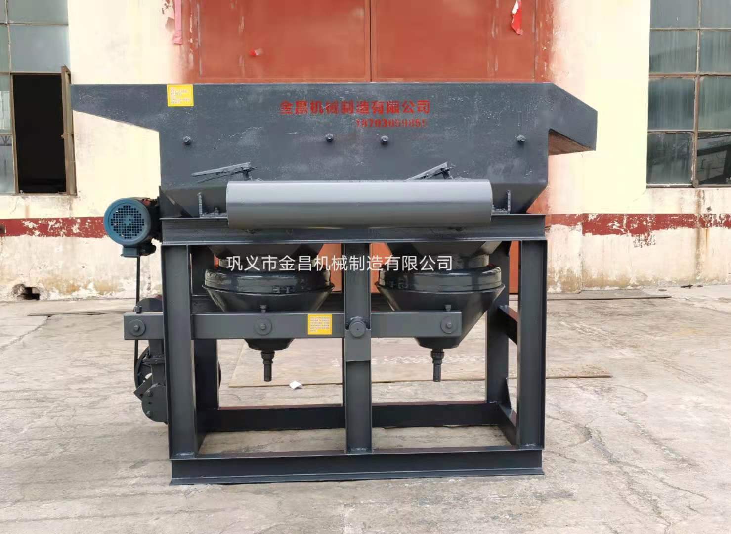 該機可分為兩段,每段有跳汰室和隔膜室,但隔膜室位于跳汰室之下,隔膜式是一個可動的倒立錐體,用橡皮圈與跳汰室下部的錐形部分相連,可動錐體與搖動框相連,搖動框與機架鉸接,偏心連桿裝置的連桿和搖動框架的一端相連,由于偏心傳動機構帶動搖動框架搖動,從而帶動兩個可動錐體交替上下往復運動。于是在跳汰機中形成上升下降水流。篩下水由水管從跳汰室側壁給入,重產物由可動錐體底部的閥門排出。LTA70/2跳汰機是在LTA1010/2跳汰機的基礎上研發改進而成的小型跳汰機選礦設備,該機體積較小,沖程、沖次可獨立調節,是一種小型重力選礦設備,適用于小型選礦廠。
