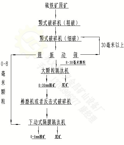 該工藝流程僅適用于要求預先回收粗粒硫鐵礦的硫鐵礦選礦廠,對于生產硫精砂的企業則無需如此復雜的工藝流程,只需經過兩次破碎,破碎后的物料直接進入棒磨機或者細碎機細碎后進入下動式隔膜跳汰機分選即可獲得純凈的硫精砂。